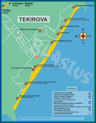 , otoczona sosnowym lasem u podnóża potężnych gór Taurus jest dobrym miejscem osób lubiących wypoczynek w spokojnej okolicy. Krystalicznie czysta woda w morzu zachęca do kąpieli.Warto wybrać się 25 km na południe od miejscowości, aby zobaczyć położone niedaleko miasta Çırali miejsce zwane Chimerą. Ze znajdujących się tu rozpadlin skalnych wydobywa się samozapalający się gaz - słynny "wieczny ogień" Chimery.
