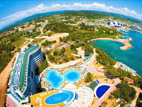 | Baseny i plaża: | kompleks 6 basenów (1 kryty) i 1 dziecięcy oraz olbrzymi aquapark z 24 zjeżdżalniami + 50 m do plaży |